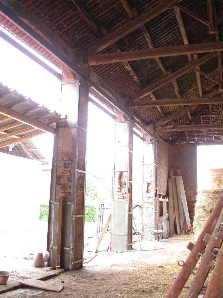 La committenza di quest'opera ha voluto utilizzare come ricovero attrezzi e fienile, una porzione di edificio prima adibito a stalla. è stato quindi necessario demolire la soletta intermedia e realizzare le aperture in lasciando solamente i pilastri. Considerando che quello che resta demolendo una muratura non è un pilastro ma una parte di muro, nel senso che la disposizione dei mattoni cambia, è stato necessario realizzare il rinforzo dei pilastri mediante una "cerchiatura" con elementi metallici. Durante l'intervento Dopo l'intervento